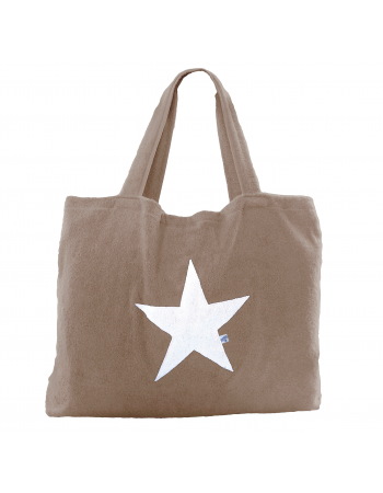Unser Klassiker: Die Beachtasche im XL-Format aus wunderbar weicher Frottee-Baumwolle bietet jede Menge Stauraum für alle Strandutensilien. Auf der Außenseite befindet sich eine Stern-Applikation in weiß. Im Innenteil sind drei Schlaufen angebracht, die mit 2 Karabinern versehen sind und mit denen die Strandtasche ganz einfach verschlossen werden kann. Farbe: taupe - beige Qualität: 100% vorgewaschene Frottee-Baumwolle Gewicht: 500 g/m² Höhe: 50 cm, Breite: 64 cm, Höhe: 70 cm mit Träger Waschbar bei 30°